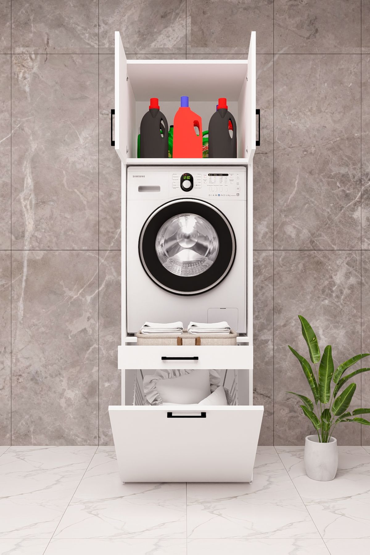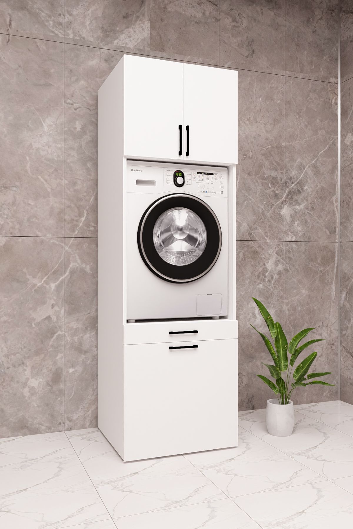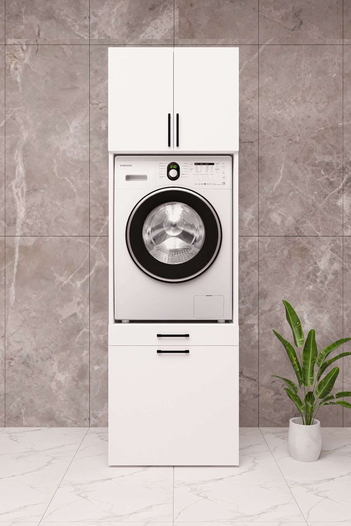 MDF ÇİFT SEPETLİ ÇAMAŞIR MAKİNESİ VE KURUTMA MAKİNESİ DOLABI ÇEKMECELİ BEYAZ DEMİRBAL MOBİLYA