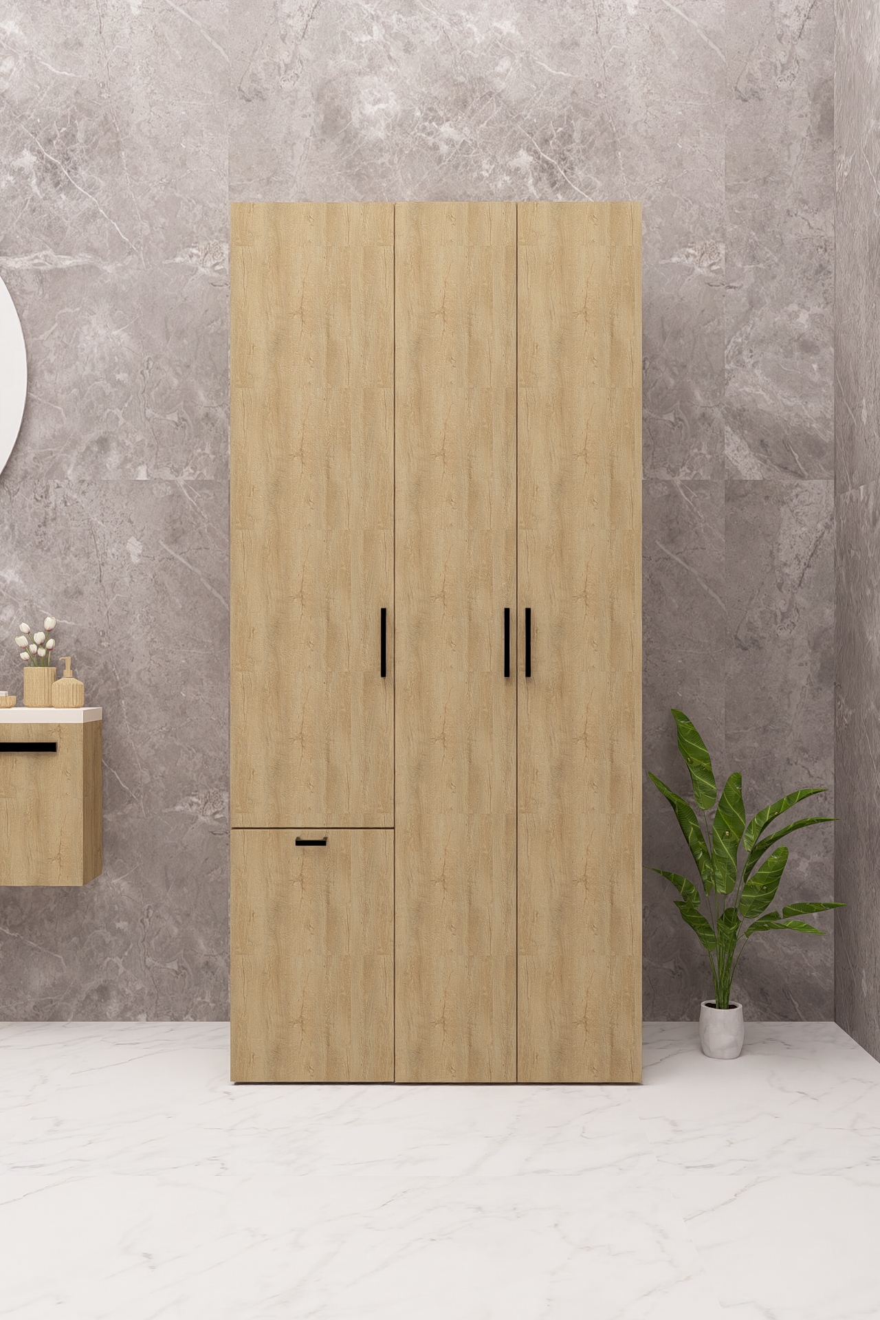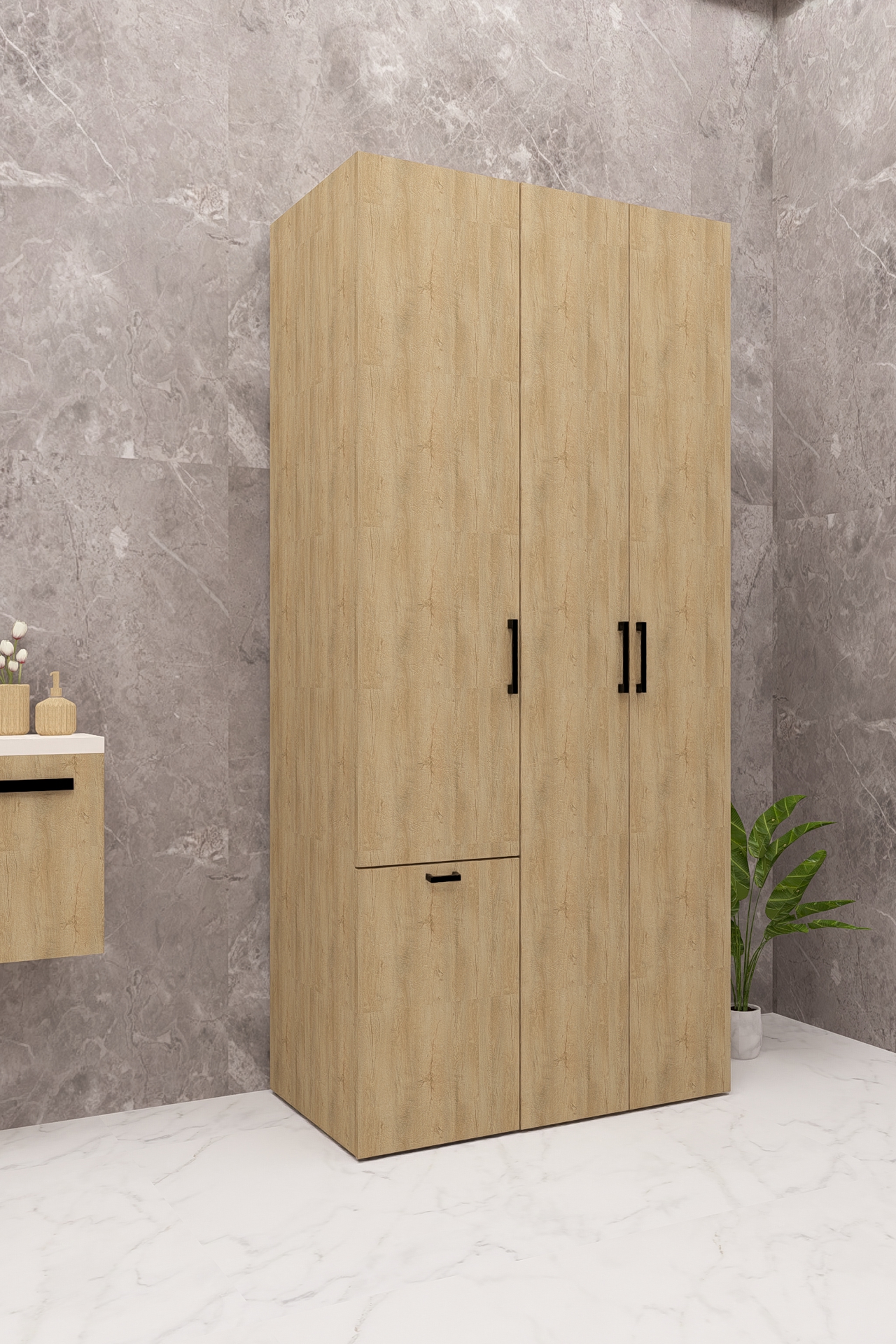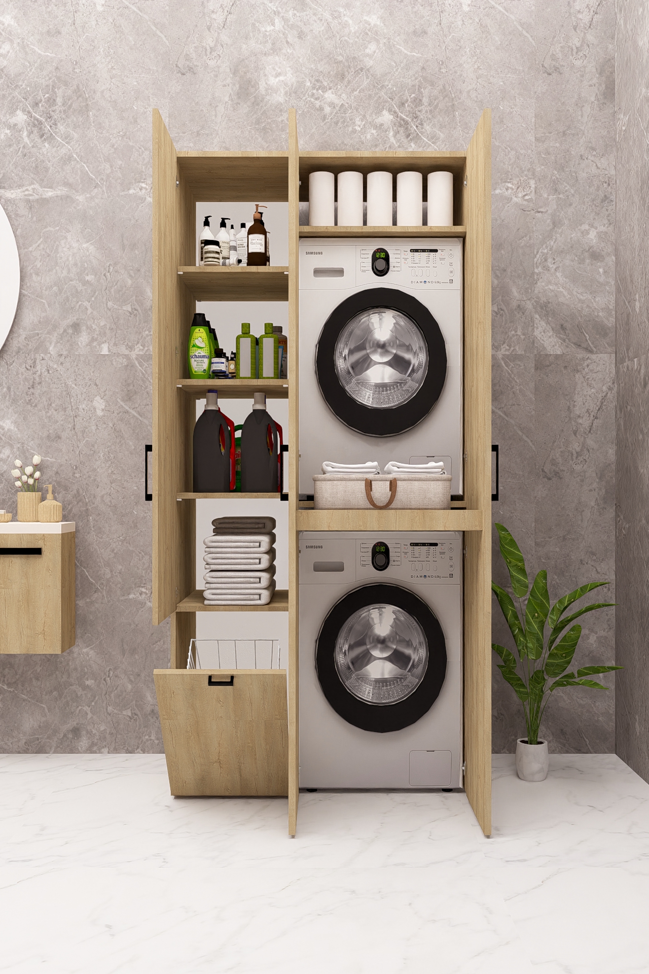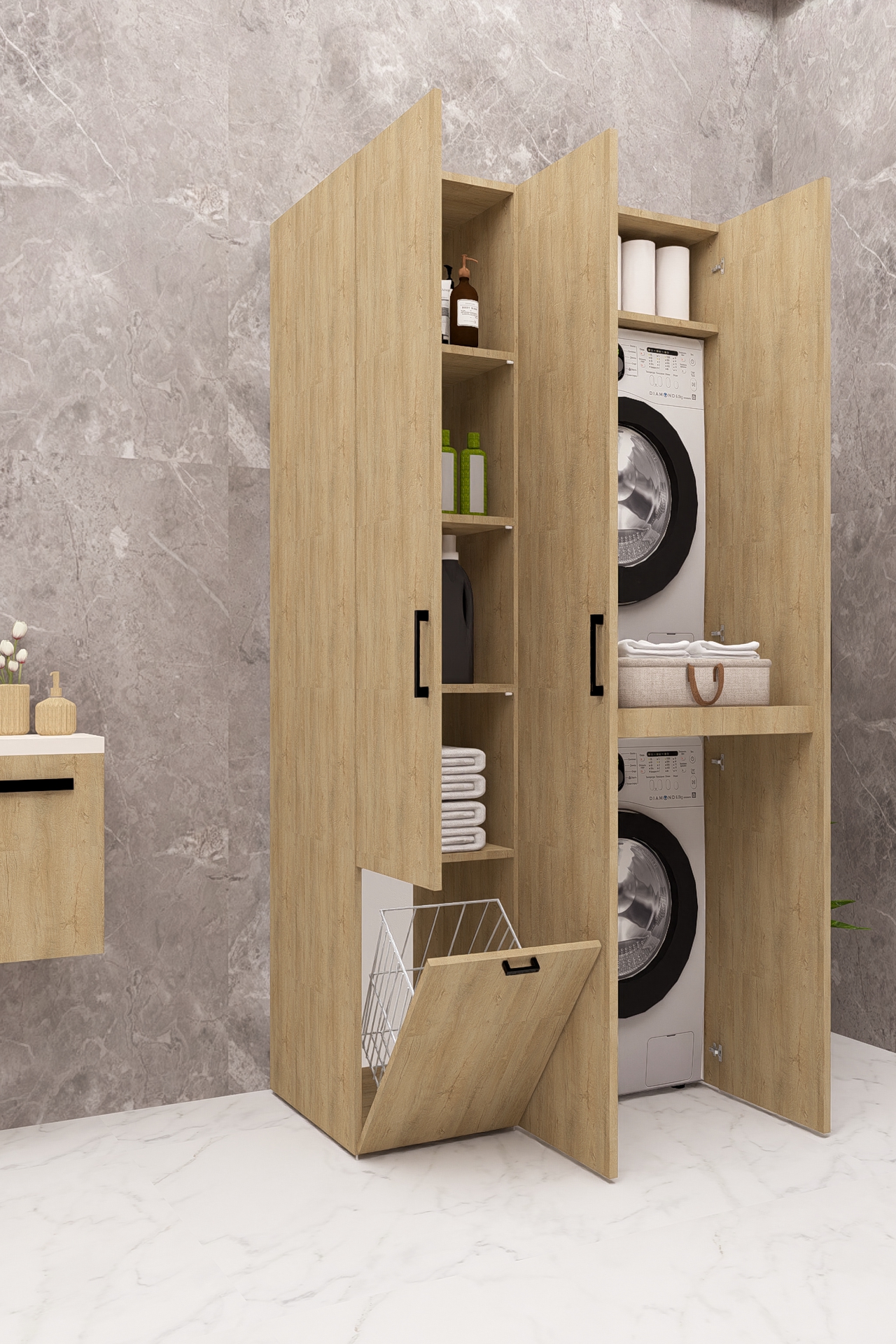 MDF SEPETLİ KAPAKLI ÇAMAŞIR MAKİNESİ VE KURUTMA MAKİNESİ DOLABI ÇEKMECELİ AHŞAP LEFKAS MEŞE DEMİRBAL MOBİLYA