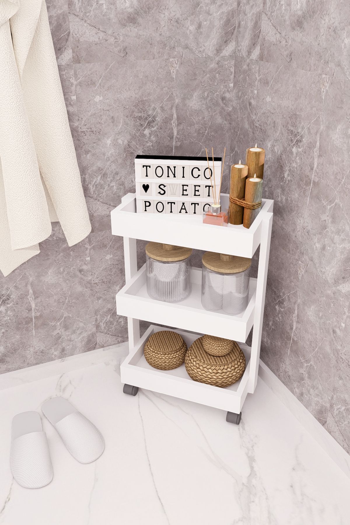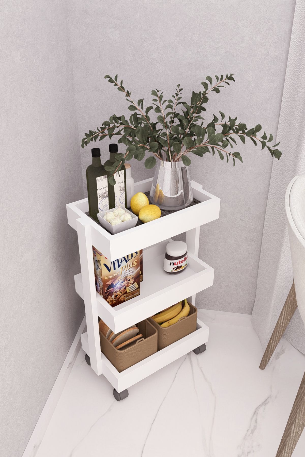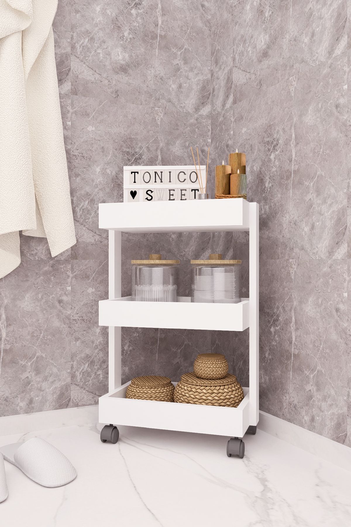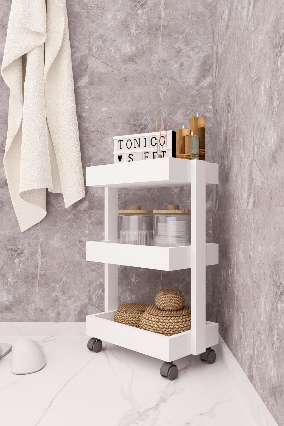 MDF TEKERLEKLİ SEHPA DÜZENLEYİCİ RAF BEYAZ DEMİRBAL MOBİLYA