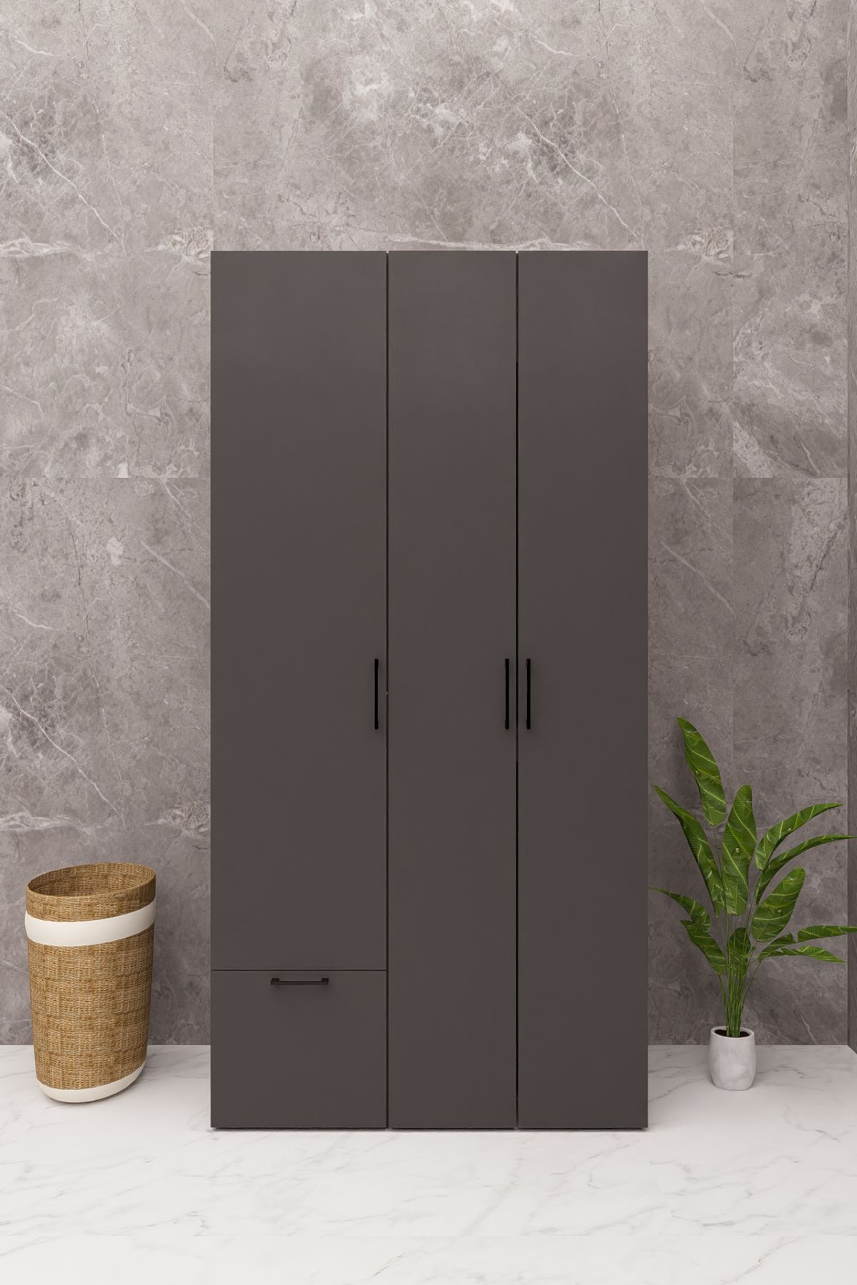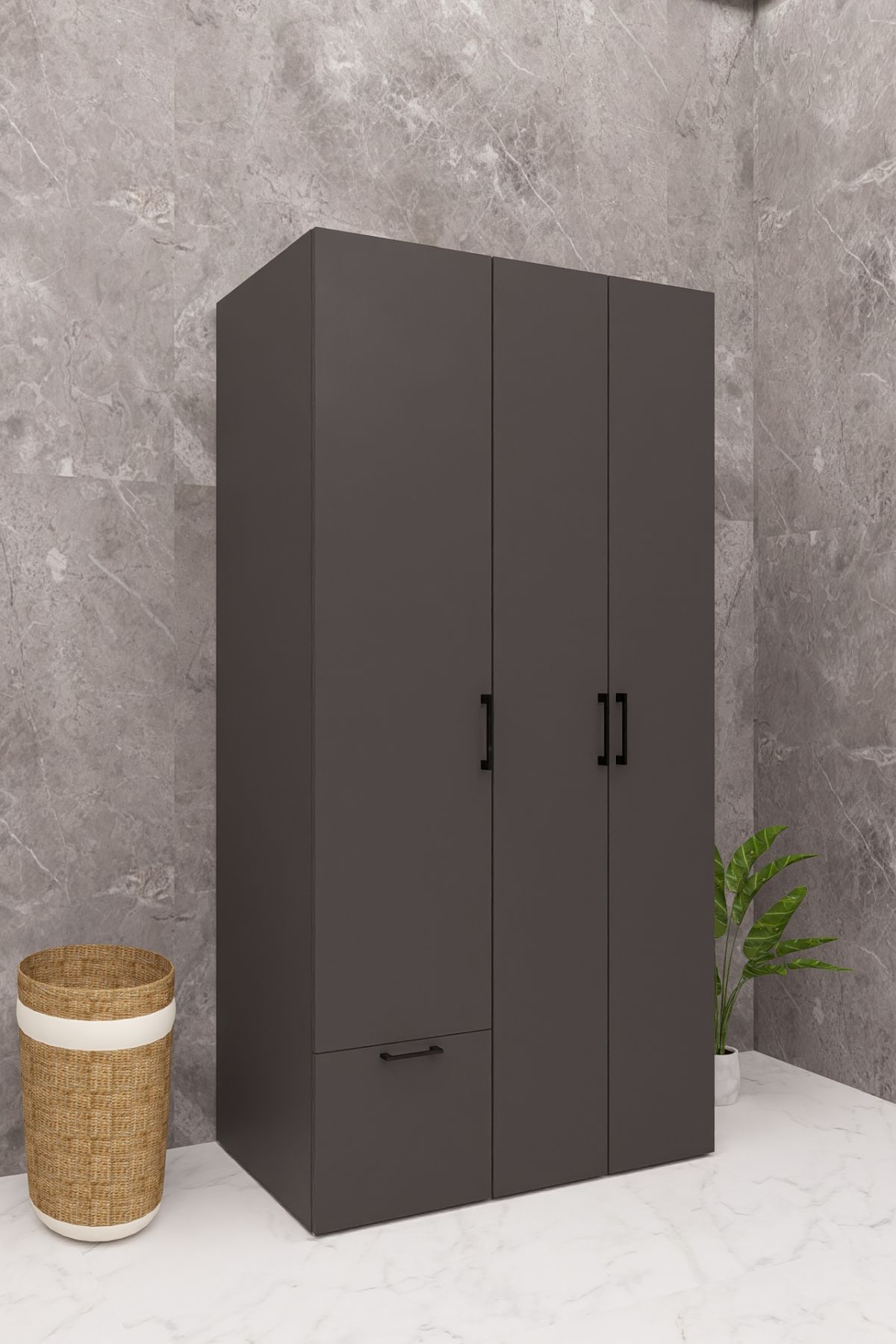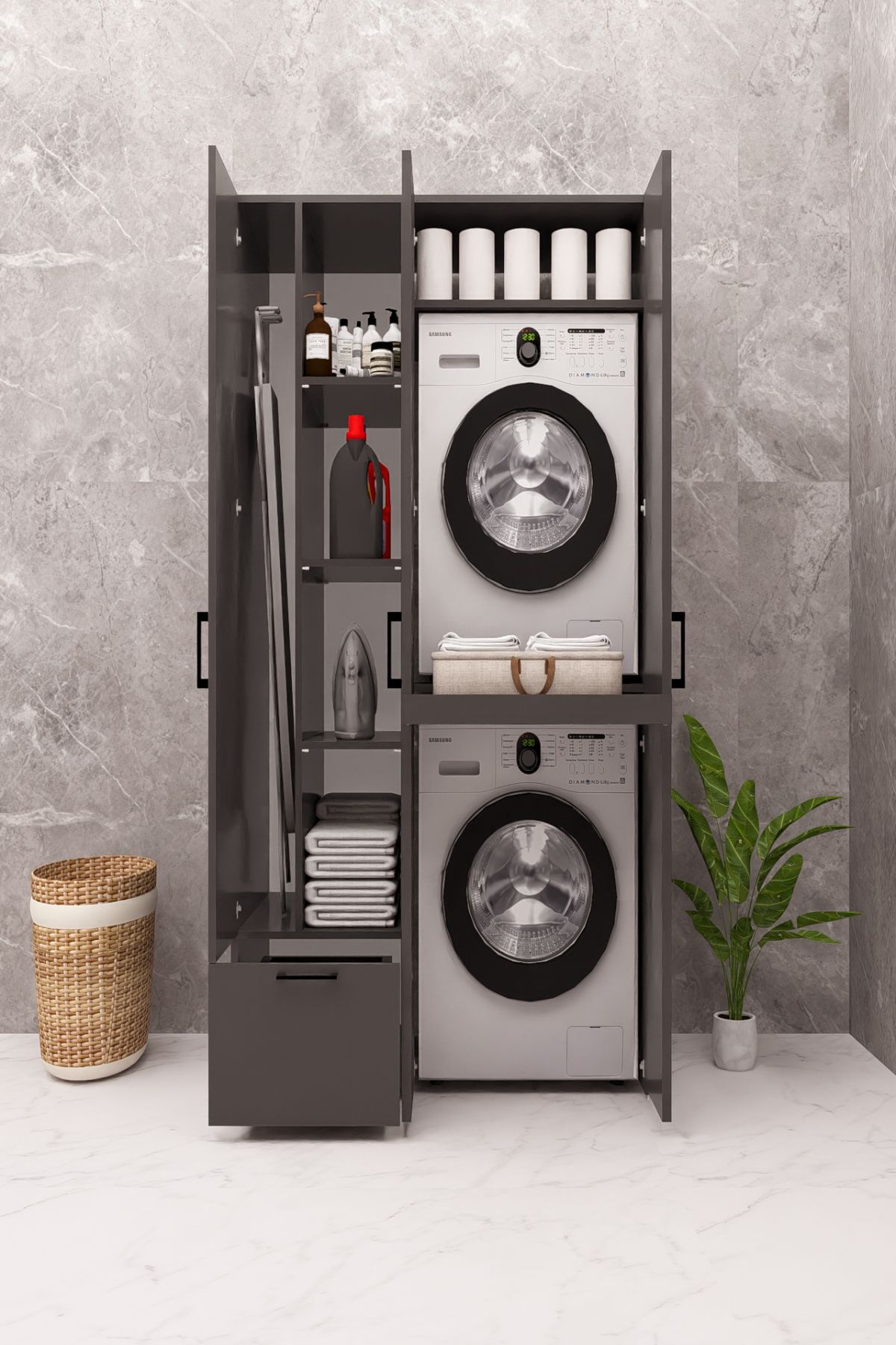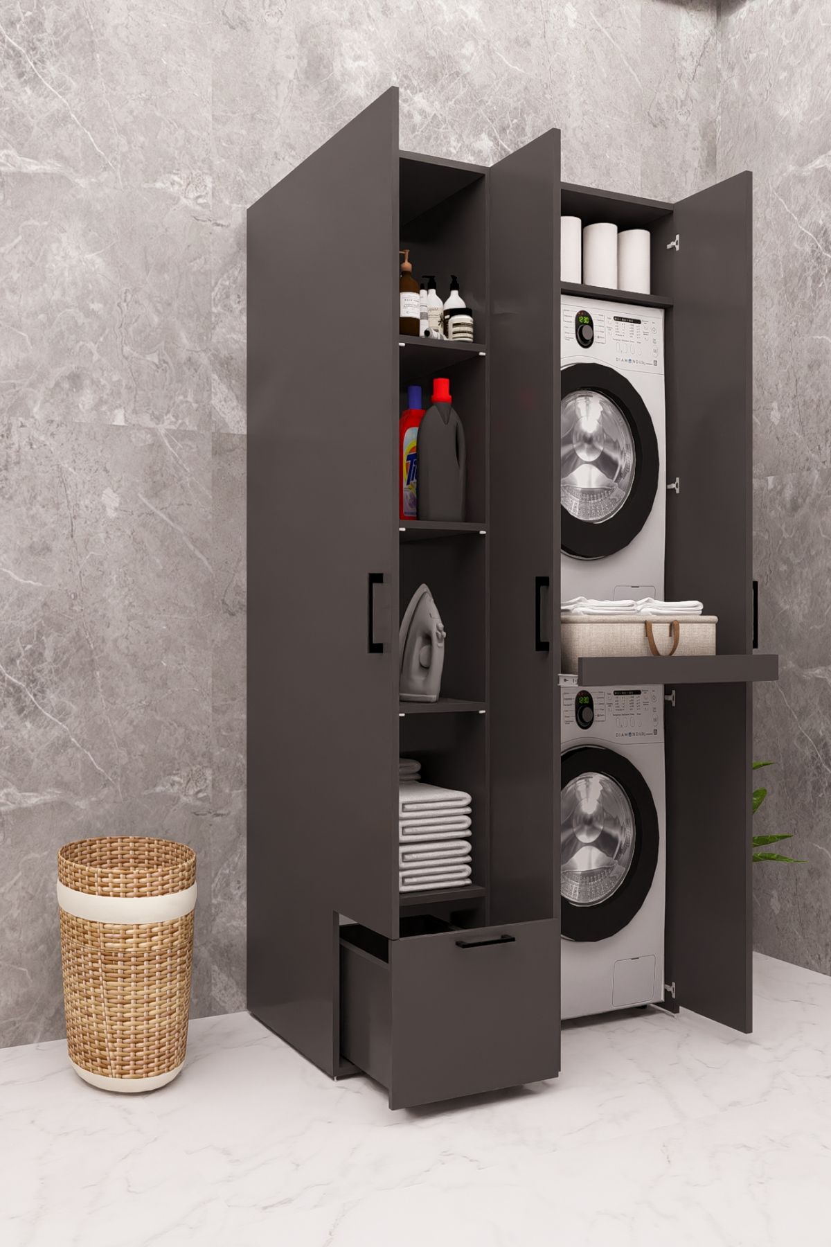 MDF ÜTÜ MASALI KAPAKLI ÇAMAŞIR MAKİNESİ VE KURUTMA MAKİNESİ DOLABI ÇEKMECELİ ANTRASİT DEMİRBAL MOBİLYA